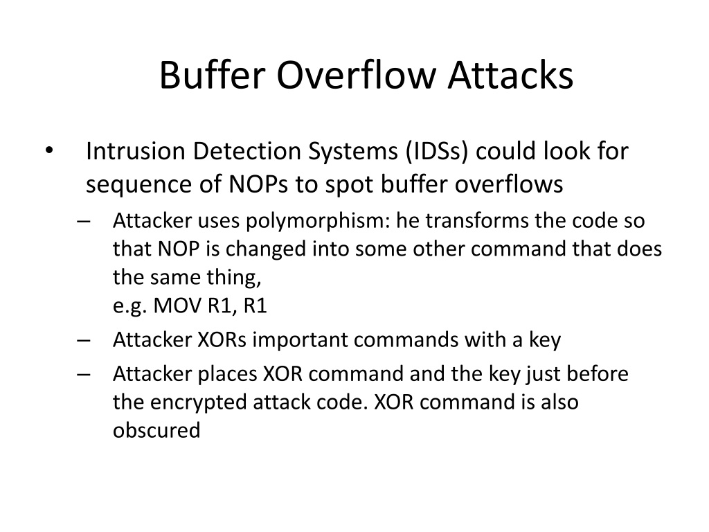 Buffer Overflow Attacks • Intrusion Detection Systems (IDSs) could look for sequence of NOPs to spot buffer overflows • Attacker uses polymorphism: he transforms the code so that NOP is changed into some other command that does the same thing, e.g. MOV R1, R1 • Attacker XORs important commands with a key • Attacker places XOR command and the key just before the encrypted attack code. XOR command is also obscured