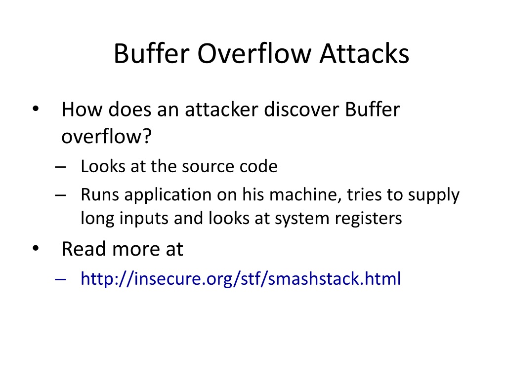 Buffer Overflow Attacks • How does an attacker discover Buffer overflow? • Looks at the source code • Runs application on his machine, tries to supply long inputs and looks at system registers • Read more at • http://insecure.org/stf/smashstack.html