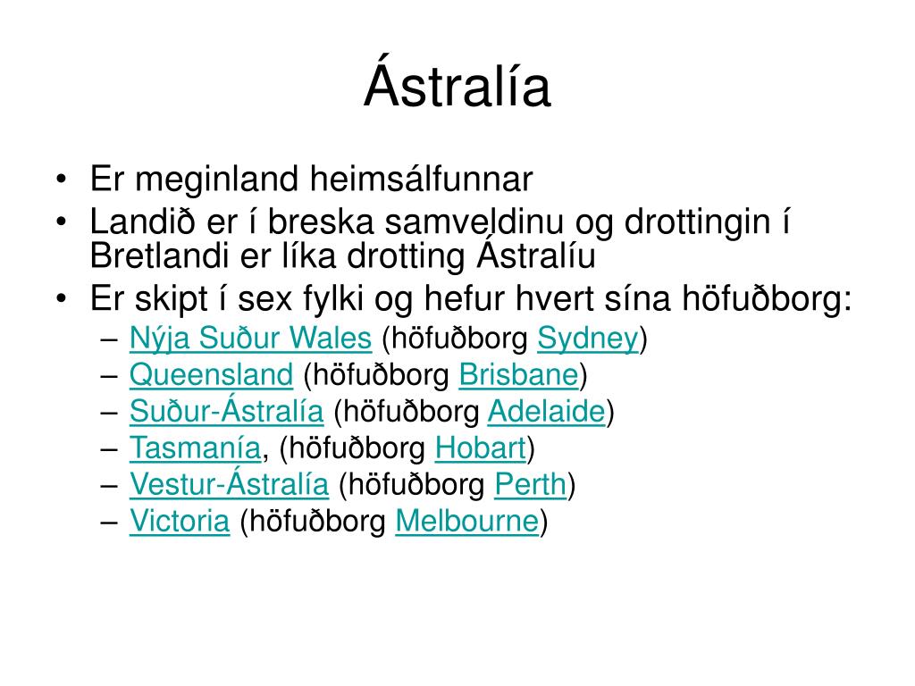 Ástralía • Er meginland heimsálfunnar • Landið er í breska samveldinu og drottingin í Bretlandi er líka drotting Ástralíu • Er skipt í sex fylki og hefur hvert sína höfuðborg: • Nýja Suður Wales (höfuðborg Sydney) • Queensland (höfuðborg Brisbane) • Suður-Ástralía (höfuðborg Adelaide) • Tasmanía, (höfuðborg Hobart) • Vestur-Ástralía (höfuðborg Perth) • Victoria (höfuðborg Melbourne)