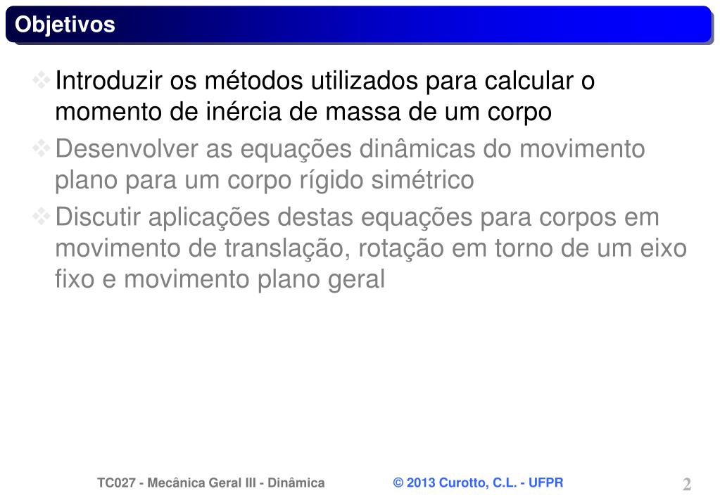 Objetivos • Introduzir os métodos utilizados para calcular o momento de inércia de massa de um corpo • Desenvolver as equações dinâmicas do movimento plano para um corpo rígido simétrico • Discutir aplicações destas equações para corpos em movimento de translação, rotação em torno de um eixo fixo e movimento plano geral