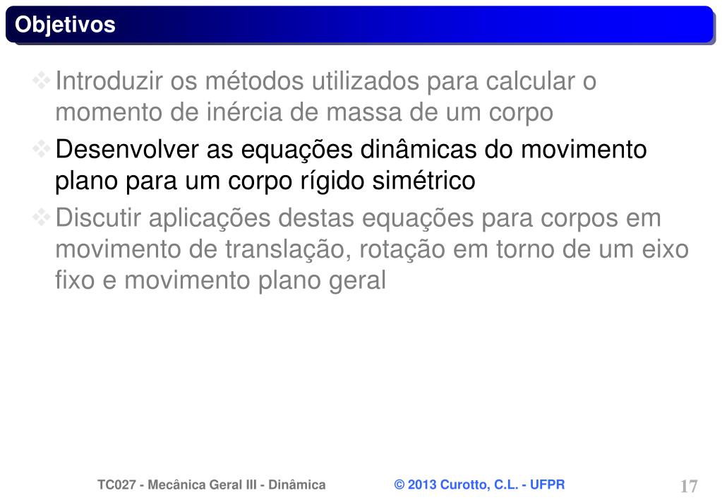 MECÂNICA - DINÂMICA. Dinâmica do Movimento Plano de um Corpo Rígido: Força e Aceleração Cap. 17. Objetivos. Introduzir os métodos utilizados para calcular o momento de inércia de massa de um corpo Desenvolver as equações dinâmicas do movimento plano para um corpo rígido simétrico