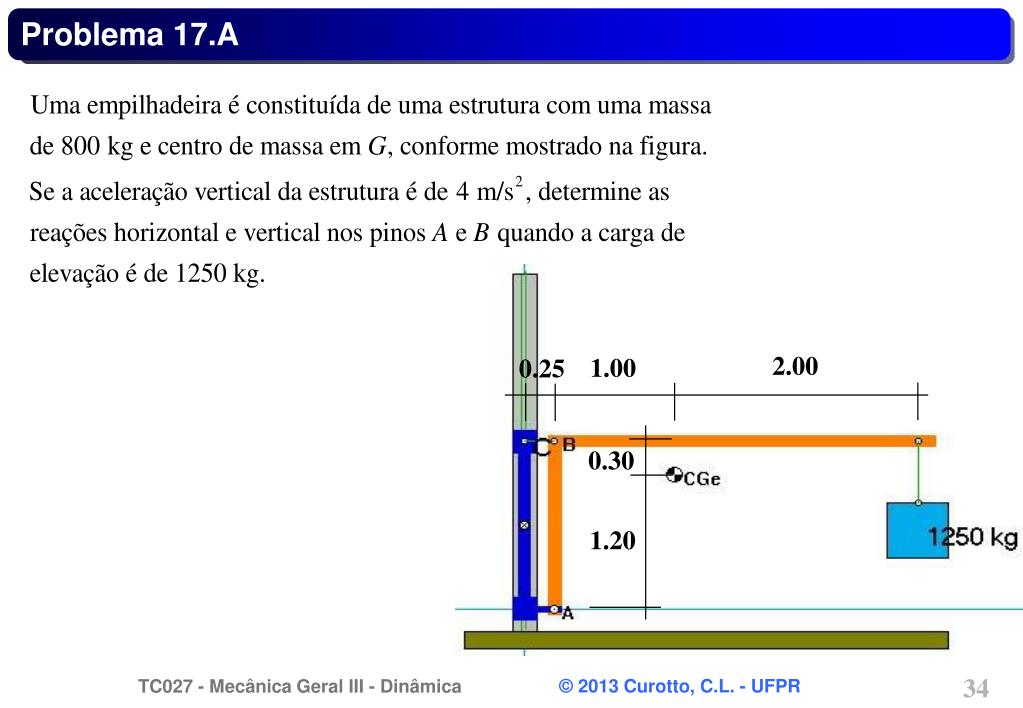 Problema 17.A - Solução Diagrama de Corpo Livre a=4 m/s2 g=9.81 m/s2 2.00 1.00 0.25 BX 0.30 CG xCG 1.20 PC AX PE AY