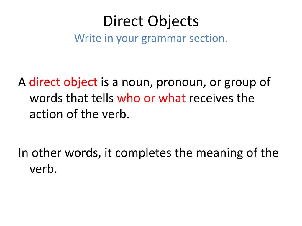 Direct ObjectsWrite in your grammar section. A direct object is a noun, pronoun, or group of words that tells who or what receives the action of the verb. In other words, it completes the meaning of the verb.