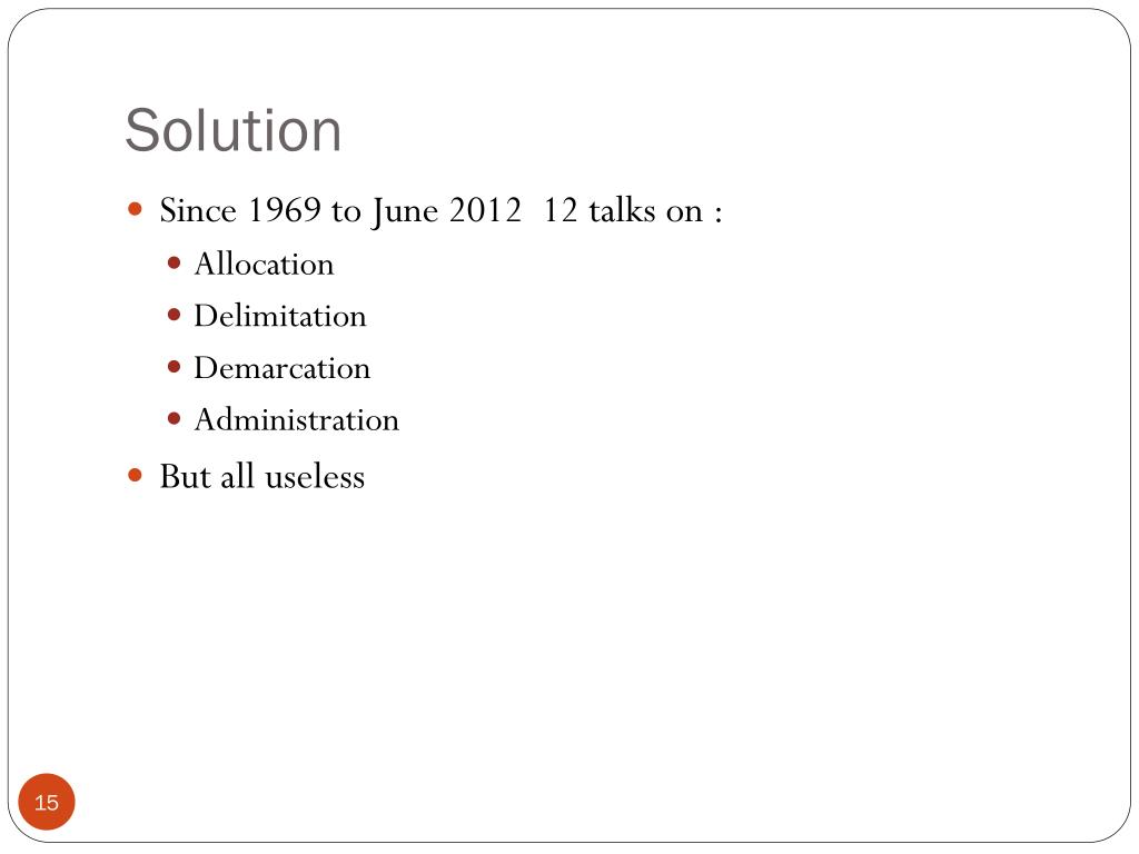 Solution • Since 1969 to June 2012 12 talks on : • Allocation • Delimitation • Demarcation • Administration • But all useless