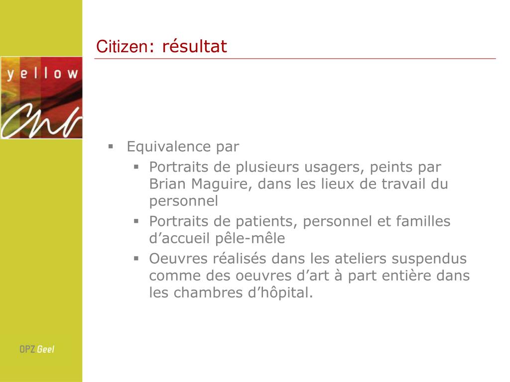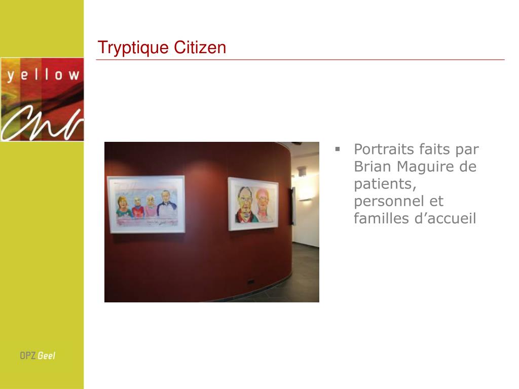 Citizen Intention du projet “Citizen”: • Faire un album “d’images et de portraits” de gens associées à l’hôpital OPZ: patients, personnel, familles d’accueil • Tous les oeuvres, ceux des artistes aussi bien que ceux des patients sont équivalents et donc traîtés de la même façon • Exposition des oeuvres en ville: support à la déstigmatisation
