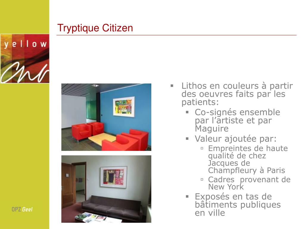 Tryptique Citizen • Lithos en couleurs à partir des oeuvres faits par les patients: • Co-signés ensemble par l’artiste et par Maguire • Valeur ajoutée par: • Empreintes de haute qualité de chez Jacques de Champfleury à Paris • Cadres provenant de New York • Exposés en tas de bâtiments publiques en ville