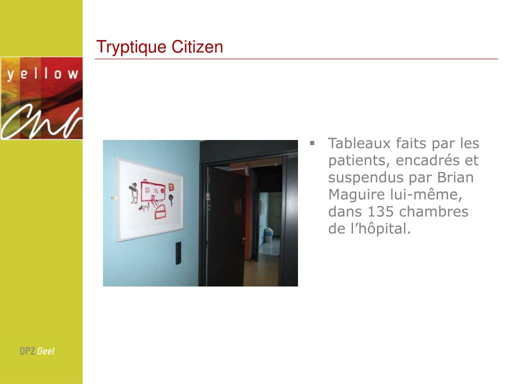 Citizen: résultat • Equivalence par • Portraits de plusieurs usagers, peints par Brian Maguire, dans les lieux de travail du personnel • Portraits de patients, personnel et familles d’accueil pêle-mêle • Oeuvres réalisés dans les ateliers suspendus comme des oeuvres d’art à part entière dans les chambres d’hôpital.