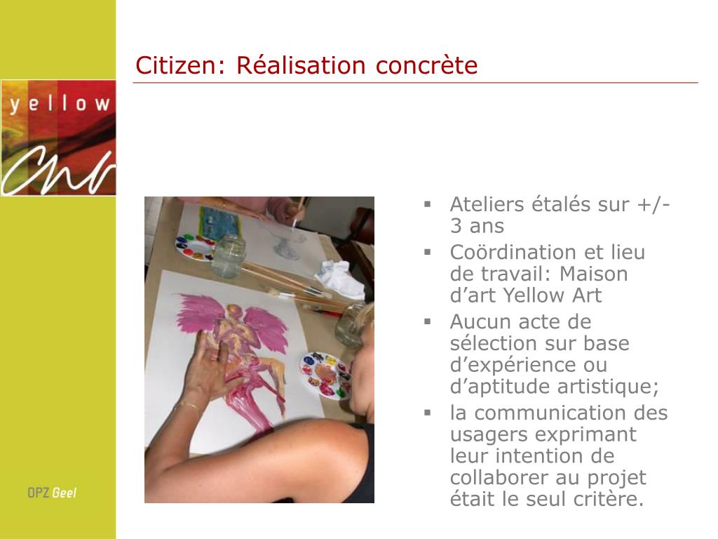 Citizen: Réalisation concrète • Ateliers étalés sur +/- 3 ans • Coördination et lieu de travail: Maison d’art Yellow Art • Aucun acte de sélection sur base d’expérience ou d’aptitude artistique; • la communication des usagers exprimant leur intention de collaborer au projet était le seul critère.