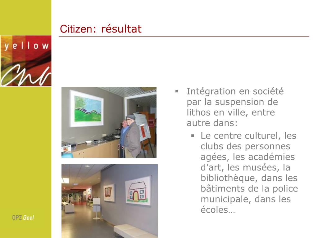 Citizen: résultat • Intégration en société par la suspension de lithos en ville, entre autre dans: • Le centre culturel, les clubs des personnes agées, les académies d’art, les musées, la bibliothèque, dans les bâtiments de la police municipale, dans les écoles…