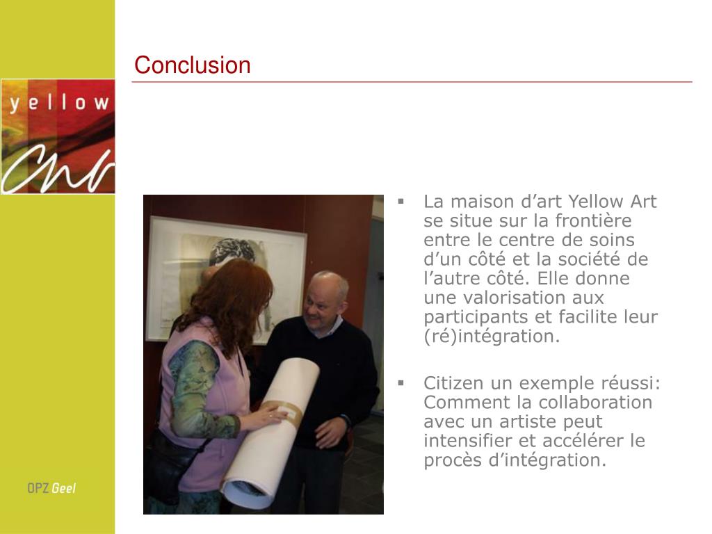 Conclusion • La maison d’art Yellow Art se situe sur la frontière entre le centre de soins d’un côté et la société de l’autre côté. Elle donne une valorisation aux participants et facilite leur (ré)intégration. • Citizen un exemple réussi: Comment la collaboration avec un artiste peut intensifier et accélérer le procès d’intégration.