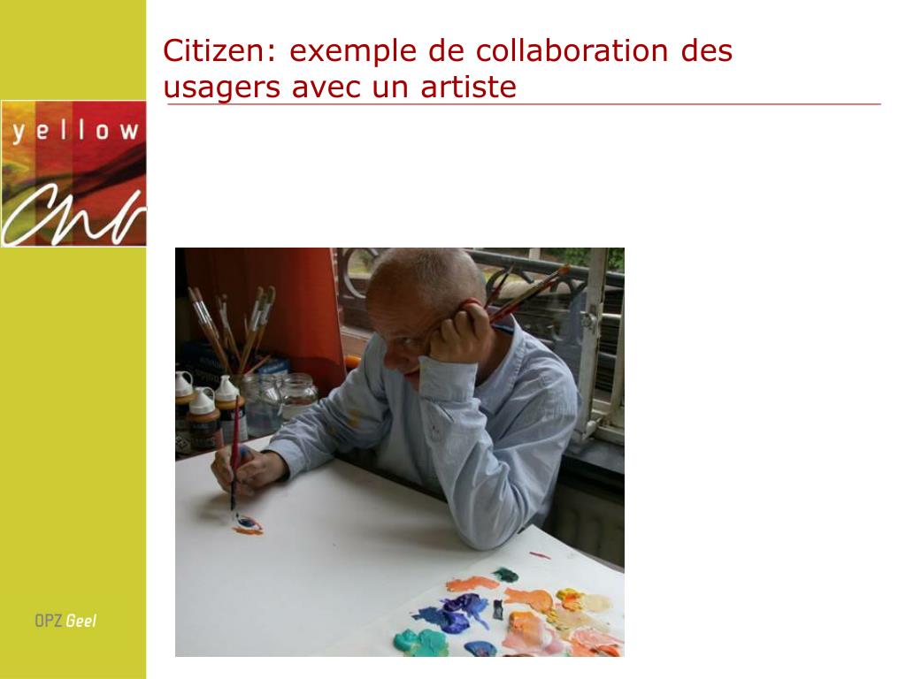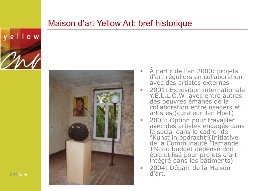 Maison d’art Yellow Art: bref historique • À partir de l’an 2000: projets d’art réguliers en collaboration avec des artistes externes • 2001: Exposition internationale Y.E.L.L.O.W avec entre autres des oeuvres émanés de la collaboration entre usagers et artistes (curateur Jan Hoet) • 2003: Option pour travailler avec des artistes engagés dans le social dans le cadre de “Kunst in opdracht”(Initiative de la Communauté Flamande: 1% du budget dépensé doit être utilisé pour projets d’art intégré dans les bâtiments) • 2004: Départ de la Maison d’art.