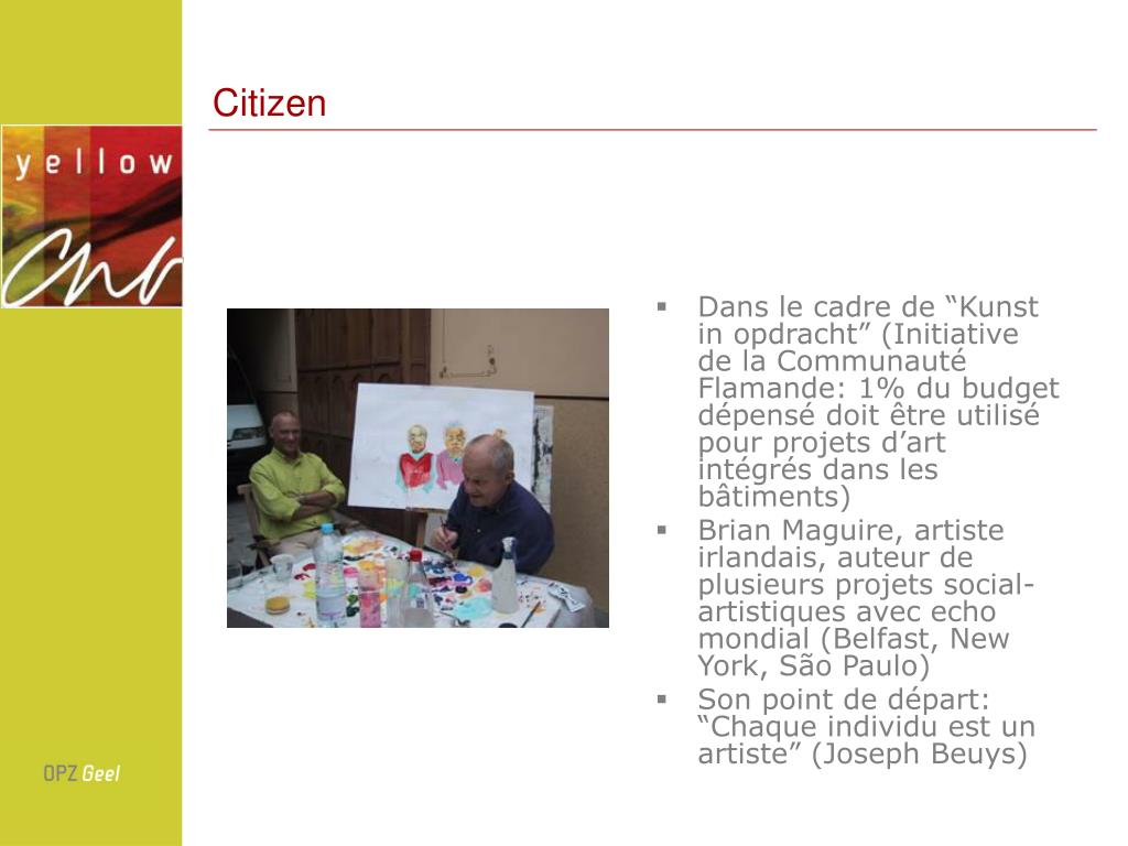Citizen • Dans le cadre de “Kunst in opdracht” (Initiative de la Communauté Flamande: 1% du budget dépensé doit être utilisé pour projets d’art intégrés dans les bâtiments) • Brian Maguire, artiste irlandais, auteur de plusieurs projets social-artistiques avec echo mondial (Belfast, New York, São Paulo) • Son point de départ: “Chaque individu est un artiste” (Joseph Beuys)