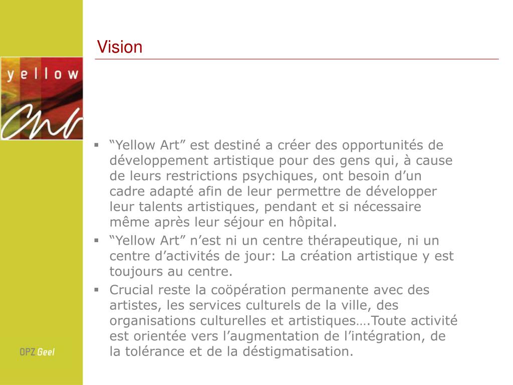 Vision • “Yellow Art” est destiné a créer des opportunités de développement artistique pour des gens qui, à cause de leurs restrictions psychiques, ont besoin d’un cadre adapté afin de leur permettre de développer leur talents artistiques, pendant et si nécessaire même après leur séjour en hôpital. • “Yellow Art” n’est ni un centre thérapeutique, ni un centre d’activités de jour: La création artistique y est toujours au centre. • Crucial reste la coöpération permanente avec des artistes, les services culturels de la ville, des organisations culturelles et artistiques….Toute activité est orientée vers l’augmentation de l’intégration, de la tolérance et de la déstigmatisation.