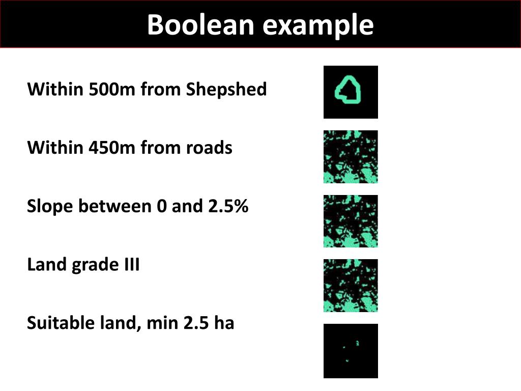 Boolean example Within 500m from Shepshed Within 450m from roads Slope between 0 and 2.5% Land grade III Suitable land, min 2.5 ha