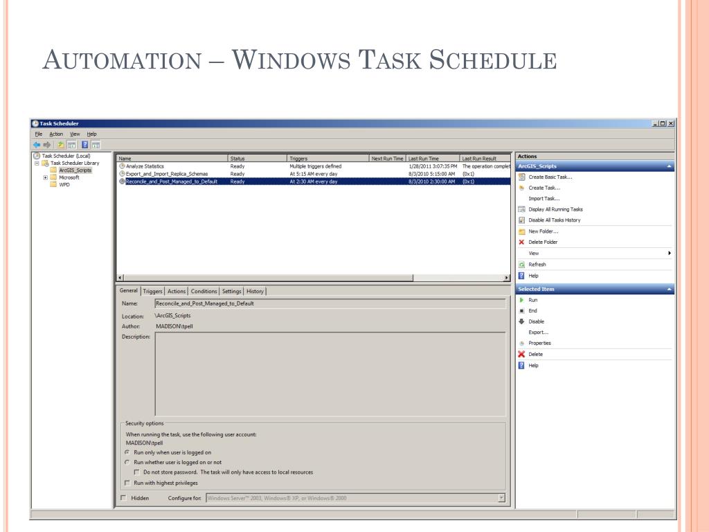 What Should be Automated? • Rebuild Database Statistics • Compress Database • Reconcile & Post database versions • Delete & Re-create Versions • Sync Database changes to Web Geodatabase