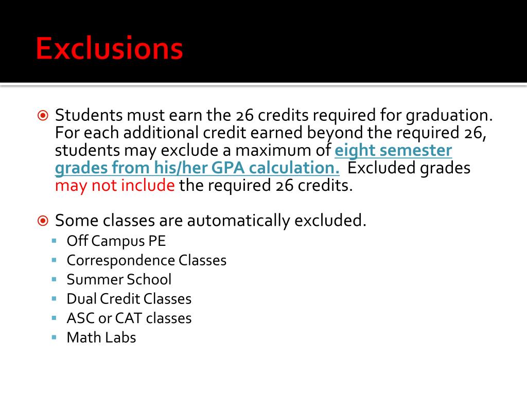 Exclusions • Students must earn the 26 credits required for graduation. For each additional credit earned beyond the required 26, students may exclude a maximum of eight semester grades from his/her GPA calculation.Excluded grades may not include the required 26 credits. • Some classes are automatically excluded. • Off Campus PE • Correspondence Classes • Summer School • Dual Credit Classes • ASC or CAT classes • Math Labs