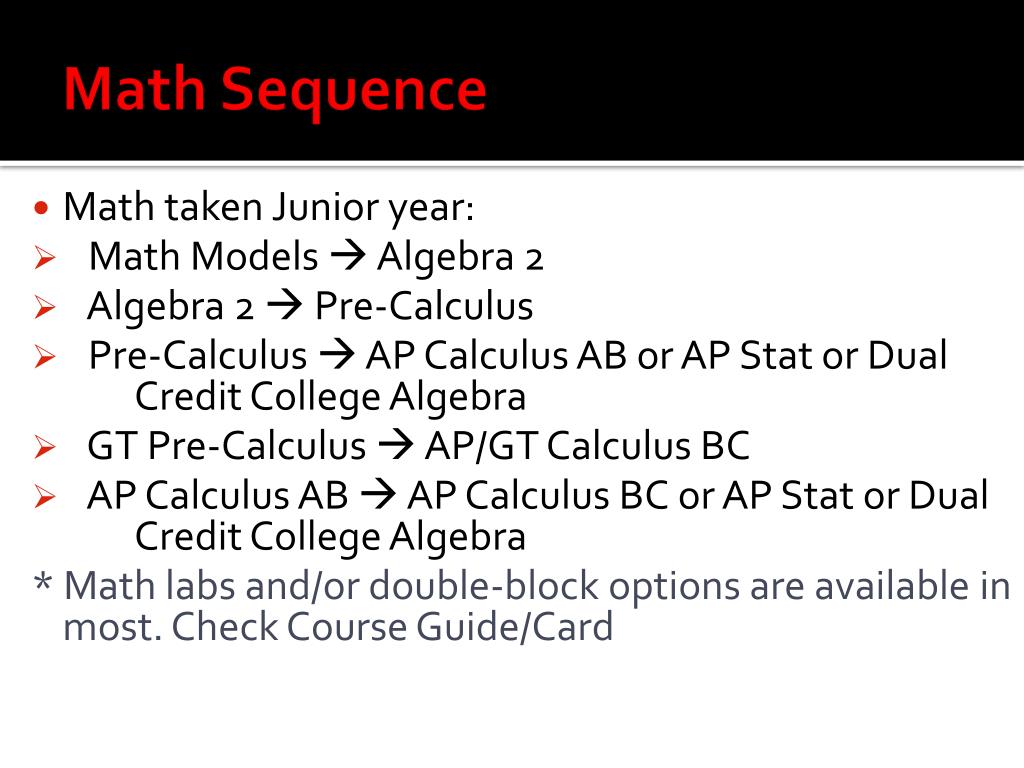 Math Sequence • Math taken Junior year: • Math Models Algebra 2 • Algebra 2 Pre-Calculus • Pre-Calculus AP Calculus AB or AP Stat or Dual Credit College Algebra • GT Pre-Calculus AP/GT Calculus BC • AP Calculus AB AP Calculus BC or AP Stat or Dual Credit College Algebra * Math labs and/or double-block options are available in most. Check Course Guide/Card