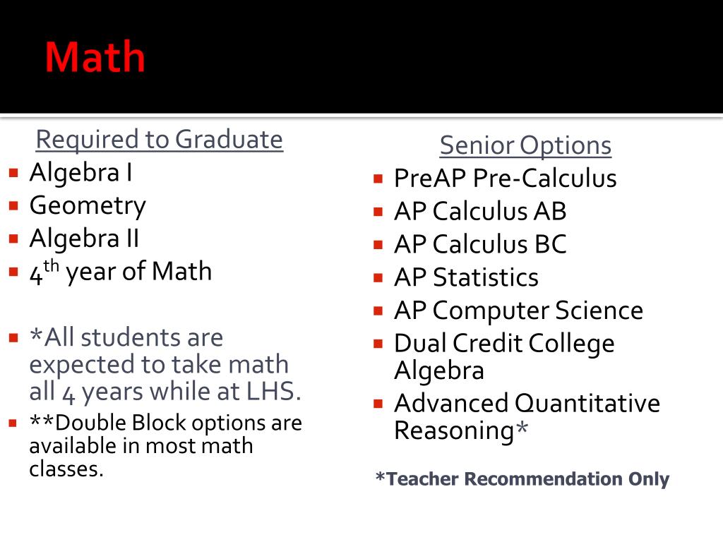 Math Required to Graduate • Algebra I • Geometry • Algebra II • 4th year of Math • *All students are expected to take math all 4 years while at LHS. • **Double Block options are available in most math classes. Senior Options • PreAP Pre-Calculus • AP Calculus AB • AP Calculus BC • AP Statistics • AP Computer Science • Dual Credit College Algebra • Advanced Quantitative Reasoning* *Teacher Recommendation Only