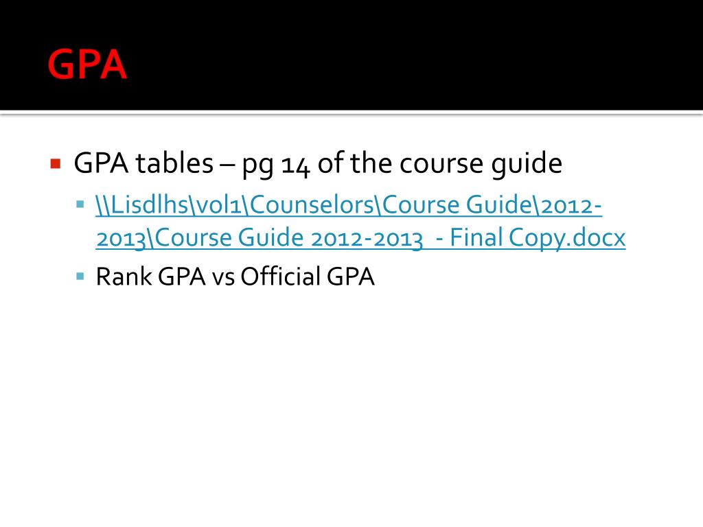 GPA • GPA tables – pg 14 of the course guide • \\Lisdlhs\vol1\Counselors\Course Guide\2012-2013\Course Guide 2012-2013 - Final Copy.docx • Rank GPA vs Official GPA