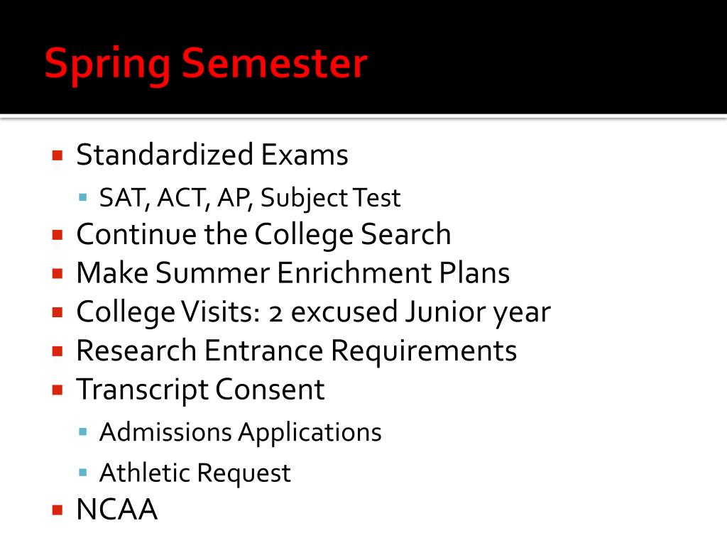 Spring Semester • Standardized Exams • SAT, ACT, AP, Subject Test • Continue the College Search • Make Summer Enrichment Plans • College Visits: 2 excused Junior year • Research Entrance Requirements • Transcript Consent • Admissions Applications • Athletic Request • NCAA