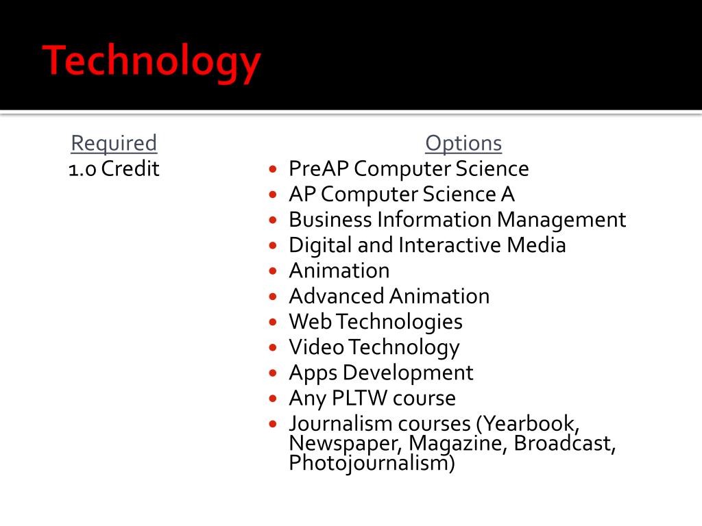 Technology Required 1.0 Credit Options • PreAP Computer Science • AP Computer Science A • Business Information Management • Digital and Interactive Media • Animation • Advanced Animation • Web Technologies • Video Technology • Apps Development • Any PLTW course • Journalism courses (Yearbook, Newspaper, Magazine, Broadcast, Photojournalism)