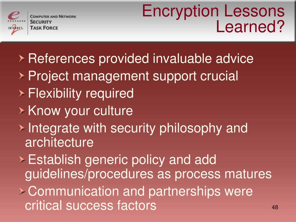 Encryption Lessons Learned? • References provided invaluable advice • Project management support crucial • Flexibility required • Know your culture • Integrate with security philosophy and architecture • Establish generic policy and add guidelines/procedures as process matures • Communication and partnerships were critical success factors