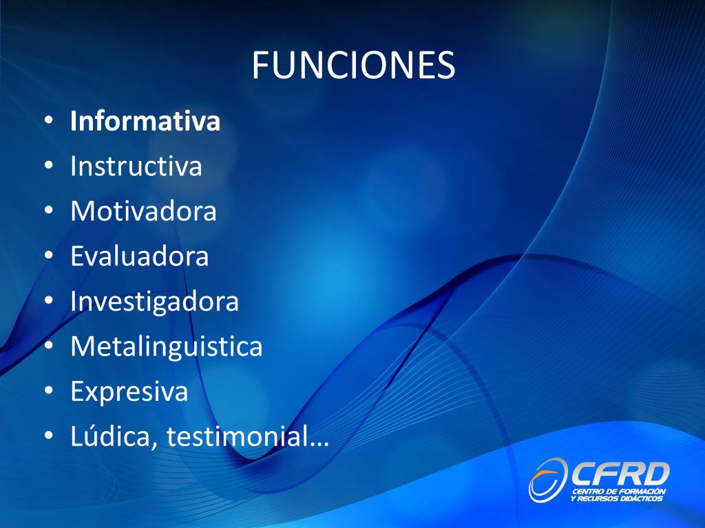 FUNCIONES Informativa Instructiva Motivadora Evaluadora Investigadora Metalinguistica Expresiva Lúdica, testimonial…