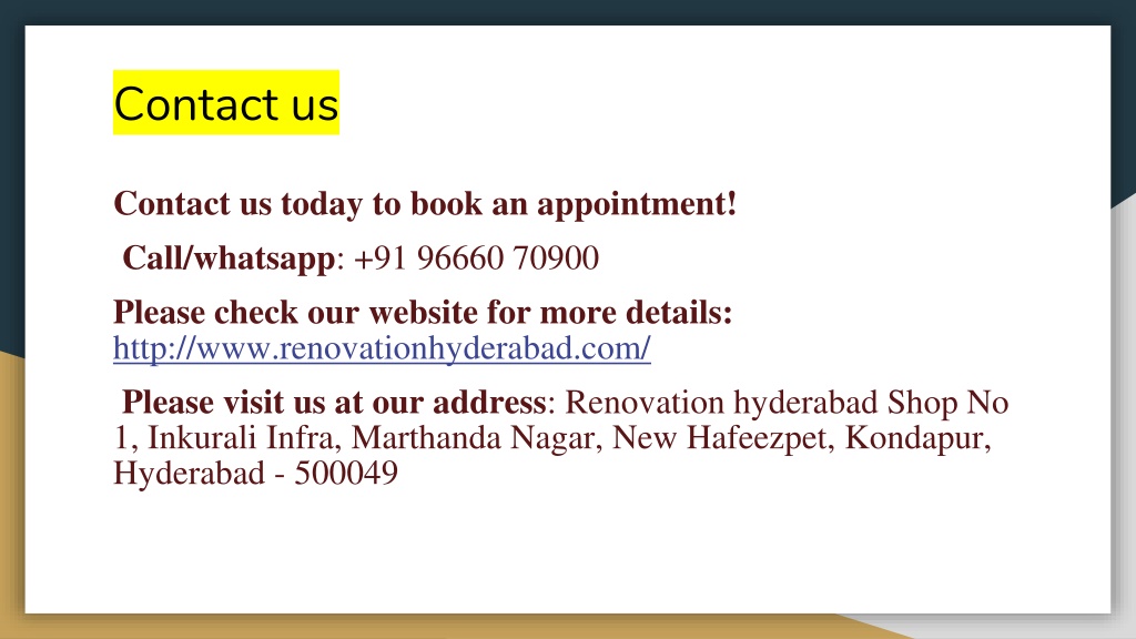 Contact us Contact us today to book an appointment! Call/whatsapp: +91 96660 70900 Please check our website for more details:http://www.renovationhyderabad.com/ Please visit us at our address: Renovation hyderabad Shop No 1, Inkurali Infra, Marthanda Nagar, New Hafeezpet, Kondapur, Hyderabad - 500049