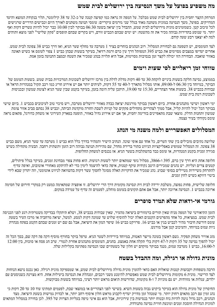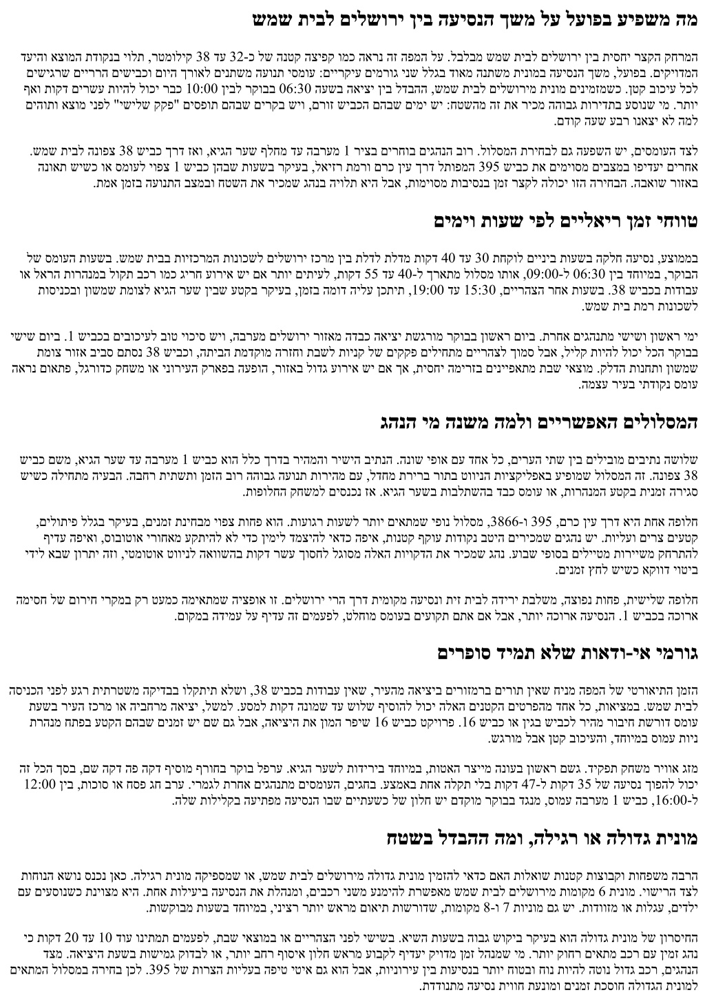 שמש תיבל םילשורי ןיב העיסנה ךשמ לע לעופב עיפשמ המ דעיהו אצומה תדוקנב יולת ,רטמוליק 38 דע 32-כ לש הנטק הציפק ומכ הארנ הז הפמה לע .לבלבמ שמש תיבל םילשורי ןיב תיסחי רצקה קחרמה םישיגרש םייררה םישיבכו םויה ךרואל םינתשמ העונת יסמוע :םיירקיע םימרוג ינש ללגב דואמ הנתשמ תינומב העיסנה ךשמ ,לעופב .םיקיודמה ףאו תוקד םירשע תויהל לוכי רבכ 10:00 ןיבל רקובב 06:30 העשב האיצי ןיב לדבהה ,שמש תיבל םילשורימ תינומ םינימזמשכ .ןטק בוכיע לכל םיהותו אצומ ינפל "ישילש קקפ" םיספות םהבש םירקב שיו ,םרוז שיבכה םהבש םימי שי :חטשהמ הז תא ריכמ ההובג תורידתב עסונש ימ .רתוי .םדוק העש עבר ונאצי אל המל .שמש תיבל הנופצ 38 שיבכ ךרד זאו ,איגה רעש ףלחמ דע הברעמ 1 ריצב םירחוב םיגהנה בור .לולסמה תריחבל םג העפשה שי ,םיסמועה דצל הנואת שישכ וא סמועל יופצ 1 שיבכ ןהבש תועשב רקיעב ,לאיזר תמרו םרכ ןיע ךרד לתופמה 395 שיבכ תא םימיוסמ םיבצמב ופידעי םירחא .תמא ןמזב העונתה בצמבו חטשה תא ריכמש גהנב היולת איה לבא ,תומיוסמ תוביסנב ןמז רצקל הלוכי וזה הריחבה .הבאוש רוזאב םימיו תועש יפל םיילאיר ןמז יחווט לש סמועה תועשב .שמש תיבב תויזכרמה תונוכשל םילשורי זכרמ ןיב תלדל תלדמ תוקד 40 דע 30 תחקול םייניב תועשב הקלח העיסנ ,עצוממב וא לארה תורהנמב לוקת בכר ומכ גירח עוריא שי םא רתוי םיתיעל ,תוקד 55 דע 40-ל ךראתמ לולסמ ותוא ,09:00-ל 06:30 ןיב דחוימב ,רקובה תוסינכבו ןושמש תמוצל איגה רעש ןיבש עטקב רקיעב ,ןמזב המוד הילע ןכתית ,19:00 דע 15:30 ,םיירהצה רחא תועשב .38 שיבכב תודובע .שמש תיב תמר תונוכשל ישיש םויב .1 שיבכב םיבוכיעל בוט יוכיס שיו ,הברעמ םילשורי רוזאמ הדבכ האיצי תשגרומ רקובב ןושאר םויב .תרחא םיגהנתמ ישישו ןושאר ימי תמוצ רוזא ביבס םתסנ 38 שיבכו ,התיבה תמדקומ הרזחו תבשל תוינק לש םיקקפ םיליחתמ םיירהצל ךומס לבא ,לילק תויהל לוכי לכה רקובב הארנ םואתפ ,לגרודכ קחשמ וא ינוריעה קראפב העפוה ,רוזאב לודג עוריא שי םא ךא ,תיסחי המירזב םינייפאתמ תבש יאצומ .קלדה תונחתו ןושמש .המצע ריעב יתדוקנ סמוע גהנה ימ הנשמ המלו םיירשפאה םילולסמה שיבכ םשמ ,איגה רעש דע הברעמ 1 שיבכ אוה ללכ ךרדב ריהמהו רישיה ביתנה .הנוש יפוא םע דחא לכ ,םירעה יתש ןיב םיליבומ םיביתנ השולש שישכ הליחתמ היעבה .הבחר תיתשתו ןמזה בור ההובג העונת תוריהמ םע ,לדחמ תרירב רותב טווינה תויצקילפאב עיפומש לולסמה הז .הנופצ 38 .תופולחה קחשמל םיסנכנ זא .איגה רעשב תובלתשהב דבכ סמוע וא ,תורהנמה עטקב תינמז הריגס ,םילותיפ ללגב רקיעב ,םינמז תניחבמ יופצ תוחפ אוה .תועוגר תועשל רתוי םיאתמש יפונ לולסמ ,3866-ו 395 ,םרכ ןיע ךרד איה תחא הפולח ףידע הפיאו ,סובוטוא ירוחאמ עקתיהל אל ידכ ןימיל דמציהל יאדכ הפיא ,תונטק ףקוע תודוקנ בטיה םיריכמש םיגהנ שי .תוילעו םירצ םיעטק ידיל אבש ןורתי הזו ,יטמוטוא טווינל האוושהב תוקד רשע ךוסחל לגוסמ הלאה תויוקדה תא ריכמש גהנ .עובש יפוסב םילייטמ תוריישמ קחרתהל .םינמז ץחל שישכ אקווד יוטיב המיסח לש םוריח ירקמב קר טעמכ המיאתמש היצפוא וז .םילשורי ירה ךרד תימוקמ העיסנו תיז תיבל הדירי תבלשמ ,הצופנ תוחפ ,תישילש הפולח .םוקמב הדימע לע ףידע הז םימעפל ,טלחומ סמועב םיעוקת םתא םא לבא ,רתוי הכורא העיסנה .1 שיבכב הכורא םירפוס דימת אלש תואדו-יא ימרוג הסינכה ינפל עגר תיתרטשמ הקידבב ולקתית אלשו ,38 שיבכב תודובע ןיאש ,ריעהמ האיציב םירוזמרב םירות ןיאש חינמ הפמה לש יטרואיתה ןמזה תעשב ריעה זכרמ וא היבחרמ האיצי ,לשמל .עסמל תוקד הנומש דע שולש ףיסוהל לוכי הלאה םינטקה םיטרפהמ דחא לכ ,תואיצמב .שמש תיבל תרהנמ חתפב עטקה םהבש םינמז שי םש םג לבא ,האיציה תא ןומה רפיש 16 שיבכ טקיורפ .16 שיבכ וא ןיגב שיבכל ריהמ רוביח תשרוד סמוע .שגרומ לבא ןטק בוכיעהו ,דחוימב סומע תוינ הז לכה ךסב ,םש הקד הפ הקד ףיסומ ףרוחב רקוב לפרע .איגה רעשל תודיריב דחוימב ,תוטאה רציימ הנועב ןושאר םשג .דיקפת קחשמ ריווא גזמ 12:00 ןיב ,תוכוס וא חספ גח ברע .ירמגל תרחא םיגהנתמ םיסמועה ,םיגחב .עצמאב תחא הלקת ילב תוקד 47-ל 