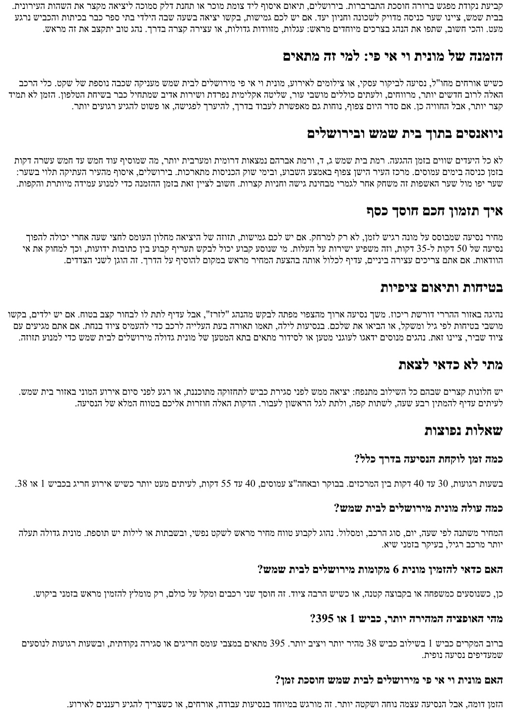 .תינוריעה תוהשה תא רצקמ האיציל הכומס קלד תנחת וא רכומ תמוצ דיל ףוסיא םואית ,םילשוריב .תורברבתה תכסוח הרורב שגפמ תדוקנ תעיבק עגרנ שיבכהו תותיכב רבכ רפס יתב ידליה הבש העשב האיצי ושקב ,תושימג םכל שי םא .דעי ןוינחו הנוכשל קיודמ הסינכ רעש ונייצ ,שמש תיבב .שארמ הז תא בצקתי בוט גהנ .ךרדב הרצק הריצע וא ,תולודג תודווזמ ,תולגע :שארמ םידחוימ םיכרצב גהנה תא ופתש ,בושח יכהו .טעמ םיאתמ הז ימל :יפ יא יו תינומ לש הנמזה בכרה ילכ .טקש לש תפסונ הבכש הקינעמ שמש תיבל םילשורימ יפ יא יו תינומ ,עוריאל םימוליצ וא ,יקסע רוקיבל העיסנ ,ל"וחמ םיחרוא שישכ דימת אל ןמזה .ןופלטה תחישב רבכ ליחתמש בידא תורישו תדרפנ תימילקא הטילש ,רוע יבשומ םיללוכ םיתעלו ,םיחוורמ ,רתוי םישדח בורל הלאה .רתוי םיעוגר עיגהל טושפ וא ,השיגפל ךרעיהל ,ךרדב דובעל תרשפאמ םג תוחונ ,ףופצ םויה רדס םא .ןכ היווחה לבא ,רתוי רצק םילשוריבו שמש תיב ךותב םיסנאוינ תוקד הרשע שמח דע שמח דוע ףיסומש המ ,רתוי תיברעמו תימורד תואצמנ םהרבא תמרו ,ד ,ג שמש תיב תמר .העגהה ןמזב םיווש םידעיה לכ אל :רעשב יולת הקיתעה ריעהמ ףוסיא ,םילשוריב .תוכראתמ תוסינכה קוש ימיבו ,עובשה עצמאב ףופצ ןשיה ריעה זכרמ .םיסומע םימיב הסינכ ןמזב .תופקהו תרתוימ הדימע עונמל ידכ הנמזהה ןמזב תאז ןייצל בושח .תורצק תוינחו השיג תניחבמ ירמגל רחא קחשמ הז תופשאה רעש לומ ופי רעש ףסכ ךסוח םכח ןומזת ךיא ךופהל הלוכי ירחא העש יצחל סמועה ןולחמ האיציה לש הזוזת ,תושימג םכל שי םא .קחרמל קר אל ,ןמזל שיגר הנומ לע ססובמש העיסנ ריחמ יא תא קוחמל ךכו ,תועודי תובותכ ןיב עובק ףירעת שקבל לוכי עובק עסונש ימ .תולעה לע תורישי עיפשמ הזו ,תוקד 35-ל תוקד 50 לש העיסנ .םידדצה ינשל ןגוה הז .ךרדה לע ףיסוהל םוקמב שארמ ריחמה תעצהב התוא לולכל ףידע ,םייניב הריצע םיכירצ םתא םא .תואדווה תויפיצ םואיתו תוחיטב ושקב ,םידלי שי םא .חוטב בצק רוחבל ול תתל ףידע לבא ,"זרזל" גהנהמ שקבל התפמ יופצהמ ךורא העיסנ ךשמ .זוכיר תשרוד יררהה רוזאב הגיהנ םע םיעיגמ םתא םא .תחנב דויצ סימעהל ידכ בכרל היילעה תעב הרואת ומאת ,הליל תועיסנב .םכלש תא ואיבה וא ,לקשמו ליג יפל תוחיטב יבשומ .הזוזת עונמל ידכ שמש תיבל םילשורימ הלודג תינומ לש ןעטמה אתב םיאתמ רודיסל וא ןעטמ ינגועל וגאדי םיסונמ םיגהנ .תאז ונייצ ,ריבש דויצ תאצל יאדכ אל יתמ .שמש תיב רוזאב ינומה עוריא םויס ינפל עגר וא ,תננכותמ הקוזחתל שיבכ תריגס ינפל שממ האיצי :חפנתמ בולישה לכ םהבש םירצק תונולח שי .העיסנה לש אלמה חווטב םכילא תורזוח הלאה תוקדה .רובעל ןושארה לגל תתלו ,הפק תותשל ,העש עבר ןיתמהל ףידע םיתיעל תוצופנ תולאש ?ללכ ךרדב העיסנה תחקול ןמז המכ .38 וא 1 שיבכב גירח עוריא שישכ רתוי טעמ םיתיעל ,תוקד 55 דע 40 ,םיסומע צ"החאבו רקובב .םיזכרמה ןיב תוקד 40 דע 30 ,תועוגר תועשב ?שמש תיבל םילשורימ תינומ הלוע המכ הלעת הלודג תינומ .תפסות שי תוליל וא תותבשבו ,ישפנ טקשל שארמ ריחמ חווט עובקל גוהנ .לולסמו ,בכרה גוס ,םוי ,העש יפל הנתשמ ריחמה .איש ינמזב רקיעב ,ליגר בכרמ רתוי ?שמש תיבל םילשורימ תומוקמ 6 תינומ ןימזהל יאדכ םאה .שוקיב ינמזב שארמ ןימזהל ץלמומ קר ,םלוכ לע לקמו םיבכר ינש ךסוח הז .דויצ הברה שישכ וא ,הנטק הצובקב וא החפשמכ םיעסונשכ ,ןכ ?395 וא 1 שיבכ ,רתוי הריהמה היצפואה יהמ םיעסונל תועוגר תועשבו ,תיתדוקנ הריגס וא םיגירח סמוע יבצמב םיאתמ 395 .רתוי ביציו רתוי ריהמ 38 שיבכ בולישב 1 שיבכ םירקמה בורב .תיפונ העיסנ םיפידעמש ?ןמז תכסוח שמש תיבל םילשורימ יפ יא יו תינומ םאה .עוריאל םיננער עיגהל ךירצשכ וא ,םיחרוא ,הדובע תועיסנב דחוימב שגרומ הז .רתוי הטקשו החונ המצע העיסנה לבא ,המוד ןמזה