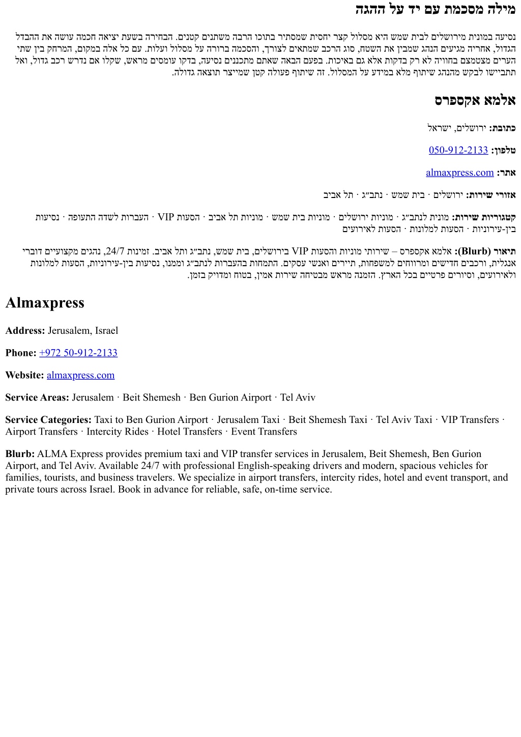 הגהה לע די םע תמכסמ הלימ לדבהה תא השוע המכח האיצי תעשב הריחבה .םינטק םינתשמ הברה וכותב ריתסמש תיסחי רצק לולסמ איה שמש תיבל םילשורימ תינומב העיסנ יתש ןיב קחרמה ,םוקמב הלא לכ םע .תולעו לולסמ לע הרורב המכסהו ,ךרוצל םיאתמש בכרה גוס ,חטשה תא ןיבמש גהנה םיעיגמ הירחא ,לודגה לאו ,לודג בכר שרדנ םא ולקש ,שארמ םיסמוע וקדב ,העיסנ םיננכתמ םתאש האבה םעפב .תוכיאב םג אלא תוקדב קר אל היווחב םצמטצמ םירעה .הלודג האצות רציימש ןטק הלועפ ףותיש הז .לולסמה לע עדימב אלמ ףותיש גהנהמ שקבל ושייבתת סרפסקא אמלא לארשי ,םילשורי :תבותכ 050-912-2133:ןופלט almaxpress.com:רתא ביבא לת · ג״בתנ · שמש תיב · םילשורי :תוריש ירוזא תועיסנ · הפועתה הדשל תורבעה · VIP תועסה · ביבא לת תוינומ · שמש תיב תוינומ · םילשורי תוינומ · ג״בתנל תינומ :תוריש תוירוגטק םיעוריאל תועסה · תונולמל תועסה · תוינוריע-ןיב ירבוד םייעוצקמ םיגהנ ,24/7 תונימז .ביבא לתו ג״בתנ ,שמש תיב ,םילשוריב VIP תועסהו תוינומ יתוריש – סרפסקא אמלא :(Blurb) רואית תונולמל תועסה ,תוינוריע-ןיב תועיסנ ,ונממו ג״בתנל תורבעהב תוחמתה .םיקסע ישנאו םיריית ,תוחפשמל םיחוורמו םישידח םיבכרו ,תילגנא .ןמזב קיודמו חוטב ,ןימא תוריש החיטבמ שארמ הנמזה .ץראה לכב םייטרפ םירויסו ,םיעוריאלו Almaxpress Address: Jerusalem, Israel Phone:+972 50-912-2133 Website:almaxpress.com Service Areas: Jerusalem · Beit Shemesh · Ben Gurion Airport · Tel Aviv Service Categories: Taxi to Ben Gurion Airport · Jerusalem Taxi · Beit Shemesh Taxi · Tel Aviv Taxi · VIP Transfers · Airport Transfers · Intercity Rides · Hotel Transfers · Event Transfers Blurb: ALMA Express provides premium taxi and VIP transfer services in Jerusalem, Beit Shemesh, Ben Gurion Airport, and Tel Aviv. Available 24/7 with professional English-speaking drivers and modern, spacious vehicles for families, tourists, and business travelers. We specialize in airport transfers, intercity rides, hotel and event transport, and private tours across Israel. Book in advance for reliable, safe, on-time service.