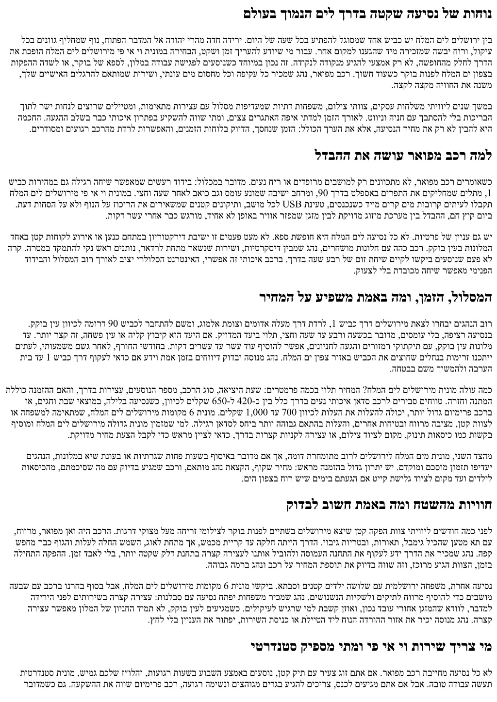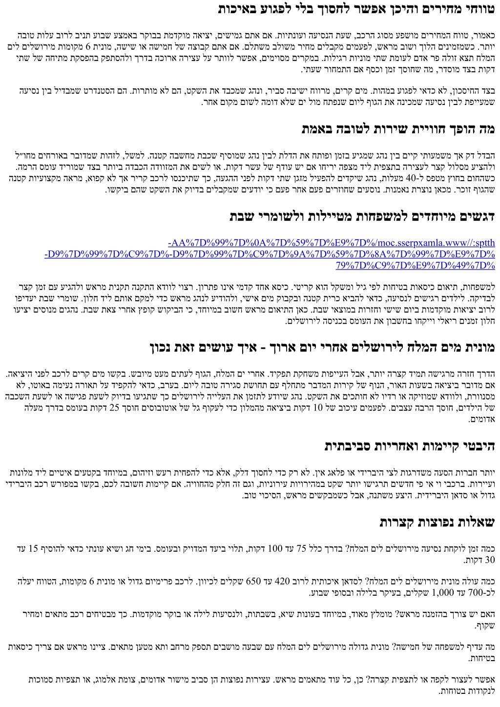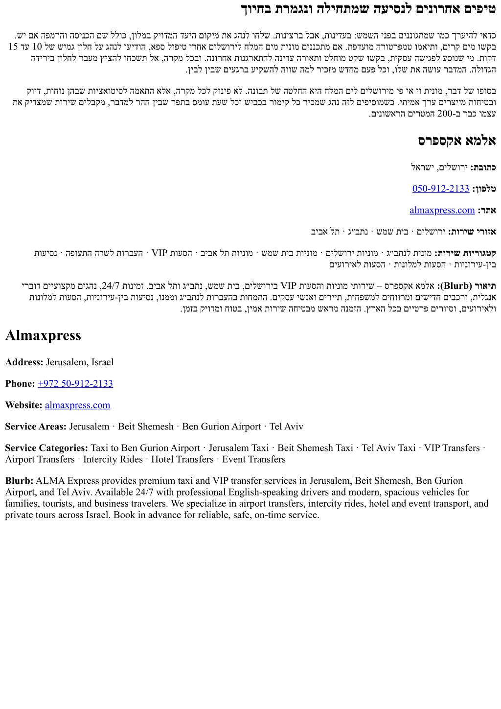 ךויחב תרמגנו הליחתמש העיסנל םינורחא םיפיט .שי םא הפמרהו הסינכה םש ללוכ ,ןולמב קיודמה דעיה םוקימ תא גהנל וחלש .תוניצרב לבא ,תונידעב :שמשה ינפב םיננוגתמש ומכ ךרעיהל יאדכ 15 דע 10 לש שימג ןולח לע גהנל ועידוה ,אפס לופיט ירחא םילשוריל חלמה םימ תינומ םיננכתמ םא .תפדעומ הרוטרפמט ומאיתו ,םירק םימ ושקב הדיריב ןולחל רבעמ ץיצהל וחכשת לא ,הרקמ לכבו .הנורחא תונגראתהל הנידע הרואתו טלחומ טקש ושקב ,תיקסע השיגפל עסונש ימ .תוקד .ןיבל ןיבש םיעגרב עיקשהל הווש המל ריכזמ שדחמ םעפ לכו ,ולש תא השוע רבדמה .הלודגה קויד ,תוחונ ןהבש תויצאוטיסל המאתה אלא ,הרקמ לכל קוניפ אל .הנובת לש הטלחה איה חלמה םיל םילשורימ יפ יא יו תינומ ,רבד לש ופוסב תא קידצמש תוריש םילבקמ ,רבדמל רהה ןיבש רפתב סמוע תעש לכו שיבכב רומיק לכ ריכמש גהנ הזל םיפיסומשכ .יתימא ךרע םירציימ תוחיטבו .םינושארה םירטמה 200-ב רבכ ומצע סרפסקא אמלא לארשי ,םילשורי :תבותכ 050-912-2133:ןופלט almaxpress.com:רתא ביבא לת · ג״בתנ · שמש תיב · םילשורי :תוריש ירוזא תועיסנ · הפועתה הדשל תורבעה · VIP תועסה · ביבא לת תוינומ · שמש תיב תוינומ · םילשורי תוינומ · ג״בתנל תינומ :תוריש תוירוגטק םיעוריאל תועסה · תונולמל תועסה · תוינוריע-ןיב ירבוד םייעוצקמ םיגהנ ,24/7 תונימז .ביבא לתו ג״בתנ ,שמש תיב ,םילשוריב VIP תועסהו תוינומ יתוריש – סרפסקא אמלא :(Blurb) רואית תונולמל תועסה ,תוינוריע-ןיב תועיסנ ,ונממו ג״בתנל תורבעהב תוחמתה .םיקסע ישנאו םיריית ,תוחפשמל םיחוורמו םישידח םיבכרו ,תילגנא .ןמזב קיודמו חוטב ,ןימא תוריש החיטבמ שארמ הנמזה .ץראה לכב םייטרפ םירויסו ,םיעוריאלו Almaxpress Address: Jerusalem, Israel Phone:+972 50-912-2133 Website:almaxpress.com Service Areas: Jerusalem · Beit Shemesh · Ben Gurion Airport · Tel Aviv Service Categories: Taxi to Ben Gurion Airport · Jerusalem Taxi · Beit Shemesh Taxi · Tel Aviv Taxi · VIP Transfers · Airport Transfers · Intercity Rides · Hotel Transfers · Event Transfers Blurb: ALMA Express provides premium taxi and VIP transfer services in Jerusalem, Beit Shemesh, Ben Gurion Airport, and Tel Aviv. Available 24/7 with professional English-speaking drivers and modern, spacious vehicles for families, tourists, and business travelers. We specialize in airport transfers, intercity rides, hotel and event transport, and private tours across Israel. Book in advance for reliable, safe, on-time service.