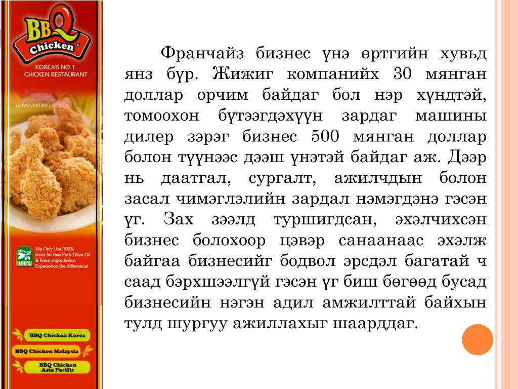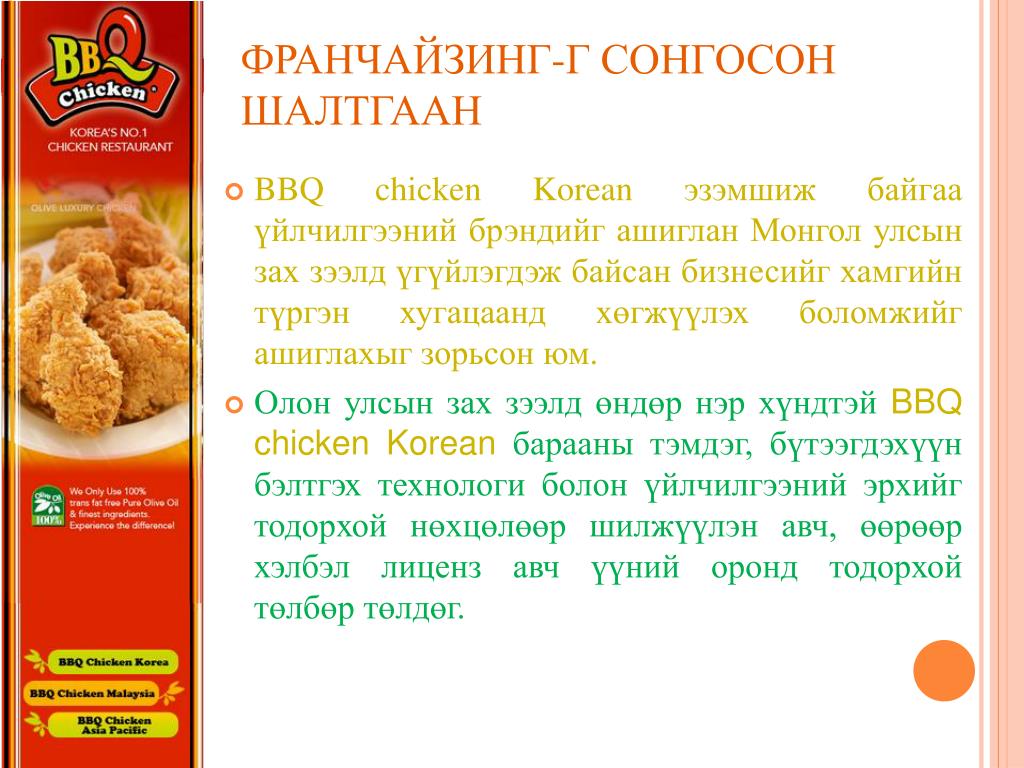 ФРАНЧАЙЗИНГ-Г СОНГОСОН ШАЛТГААН • BBQ chicken Korean эзэмшиж байгаа үйлчилгээний брэндийг ашиглан Монгол улсын зах зээлд үгүйлэгдэж байсан бизнесийг хамгийн түргэн хугацаанд хөгжүүлэх боломжийг ашиглахыг зорьсон юм. • Олон улсын зах зээлд өндөр нэр хүндтэй BBQ chicken Koreanбарааны тэмдэг, бүтээгдэхүүн бэлтгэх технологи болон үйлчилгээний эрхийг тодорхой нөхцөлөөр шилжүүлэн авч, өөрөөр хэлбэл лиценз авч үүний оронд тодорхой төлбөр төлдөг.