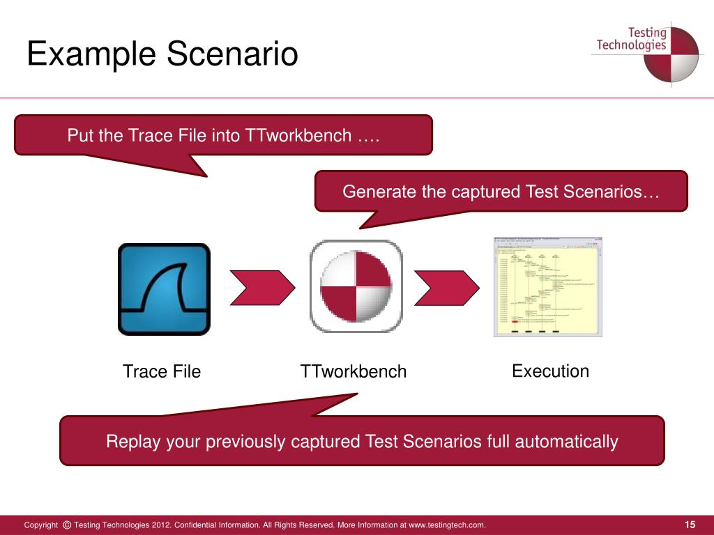 Example Scenario Put the Trace File into TTworkbench …. Generate the captured Test Scenarios… Execution Trace File TTworkbench Replay your previously captured Test Scenarios full automatically