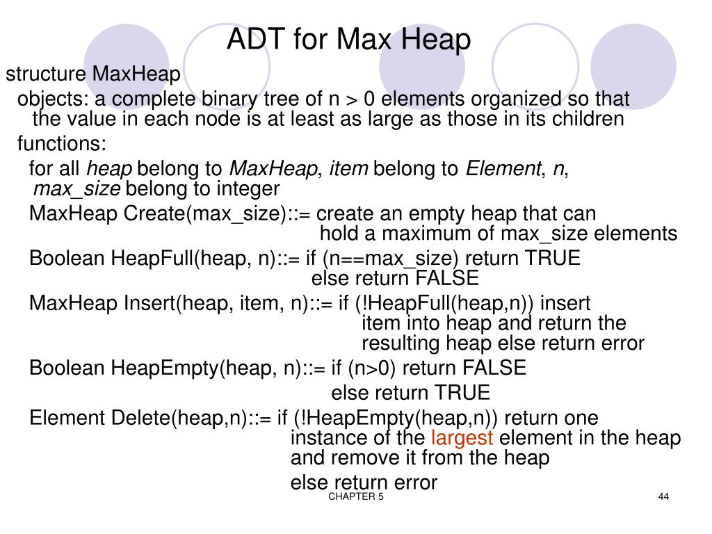 ADT for Max Heap structure MaxHeap objects: a complete binary tree of n > 0 elements organized so that the value in each node is at least as large as those in its children functions: for all heap belong to MaxHeap, item belong to Element, n, max_size belong to integer MaxHeap Create(max_size)::= create an empty heap that can hold a maximum of max_size elements Boolean HeapFull(heap, n)::= if (n==max_size) return TRUE else return FALSE MaxHeap Insert(heap, item, n)::= if (!HeapFull(heap,n)) insert item into heap and return the resulting heap else return error Boolean HeapEmpty(heap, n)::= if (n>0) return FALSE else return TRUE Element Delete(heap,n)::= if (!HeapEmpty(heap,n)) return one instance of the largest element in the heap and remove it from the heap else return error CHAPTER 5