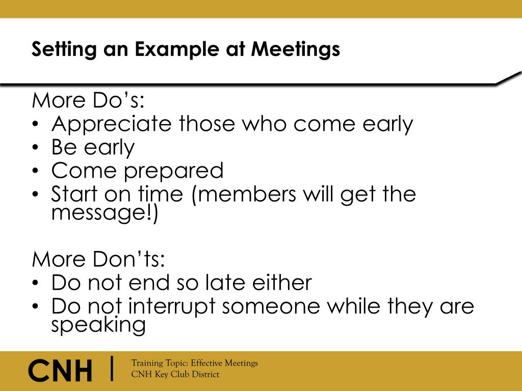 Setting an Example at Meetings • More Do’s: • Appreciate those who come early • Be early • Come prepared • Start on time (members will get the message!) • More Don’ts: • Do not end so late either • Do not interrupt someone while they are speaking