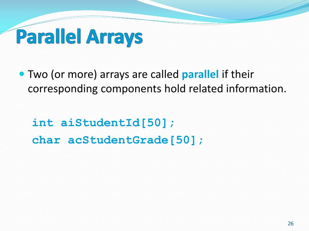 Parallel Arrays • Two (or more) arrays are called parallelif their corresponding components hold related information. intaiStudentId[50]; char acStudentGrade[50];
