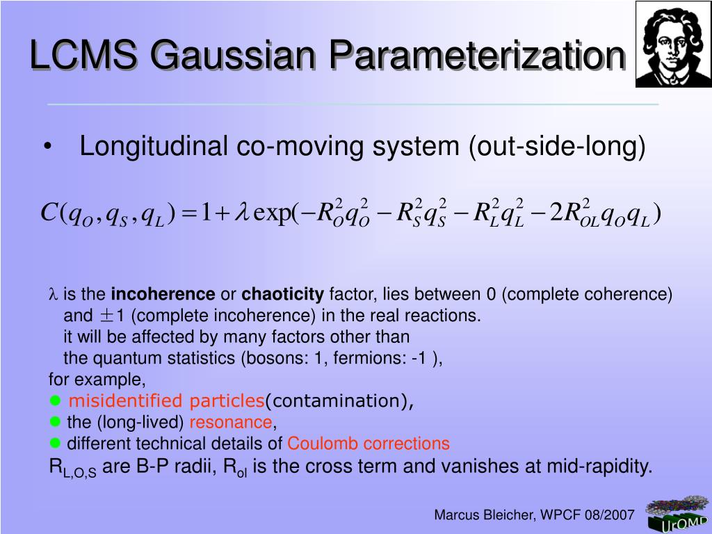 LCMS Gaussian Parameterization • Longitudinal co-moving system (out-side-long) • is the incoherence or chaoticity factor, lies between 0 (complete coherence) and ±1 (complete incoherence) in the real reactions. it will be affected by many factors other than the quantum statistics (bosons: 1, fermions: -1 ), for example, • misidentified particles(contamination), • the (long-lived) resonance, • different technical details of Coulomb corrections RL,O,S are B-P radii, Rol is the cross term and vanishes at mid-rapidity. Marcus Bleicher, WPCF 08/2007