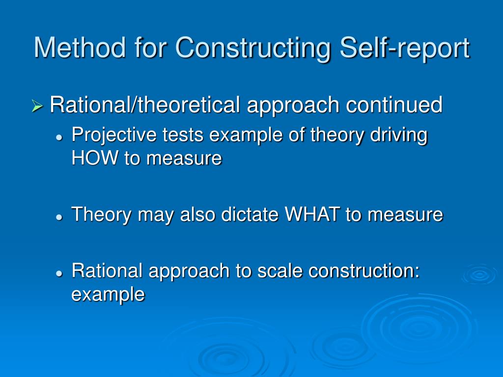 Methods for Constructing Self-Reports 2. Rational/Theoretical Approach: Relies on theory to determine the how and what of assessment Theory may dictate HOW to measure something Psychoanalytic theory projective tests Projective hypothesis: If an individual is confronted with an ambiguous stimulus, the interpretation that the individual provides is to some extent a "projection" of the individual's internal characteristics.