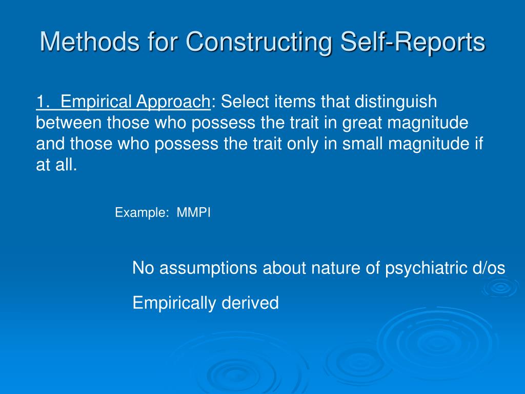 Methods for Constructing Self-Reports 1. Empirical Approach: Select items that distinguish between those who possess the trait in great magnitude and those who possess the trait only in small magnitude if at all. Example: MMPI No assumptions about nature of psychiatric d/os Empirically derived