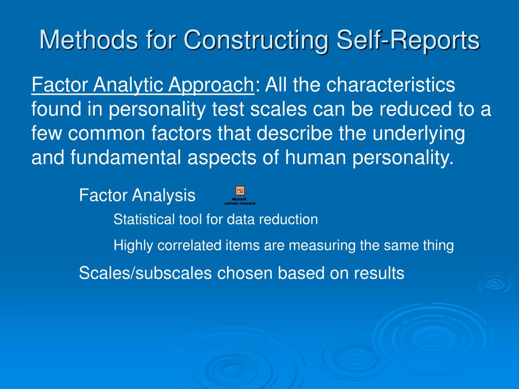 Methods for Constructing Self-Reports Factor Analytic Approach: All the characteristics found in personality test scales can be reduced to a few common factors that describe the underlying and fundamental aspects of human personality. Factor Analysis Statistical tool for data reduction Highly correlated items are measuring the same thing Scales/subscales chosen based on results