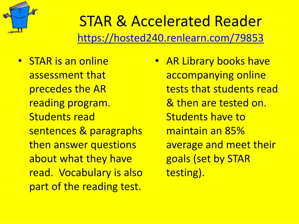 STAR & Accelerated Readerhttps://hosted240.renlearn.com/79853 • STAR is an online assessment that precedes the AR reading program. Students read sentences & paragraphs then answer questions about what they have read. Vocabulary is also part of the reading test. • AR Library books have accompanying online tests that students read & then are tested on. Students have to maintain an 85% average and meet their goals (set by STAR testing).