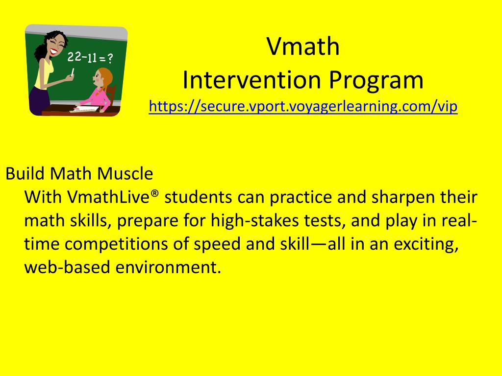 VmathIntervention Programhttps://secure.vport.voyagerlearning.com/vip Build Math MuscleWith VmathLive® students can practice and sharpen their math skills, prepare for high-stakes tests, and play in real-time competitions of speed and skill—all in an exciting, web-based environment.