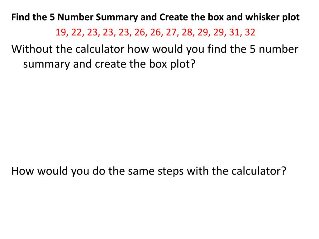 Find the 5 Number Summary and Create the box and whisker plot 19, 22, 23, 23, 23, 26, 26, 27, 28, 29, 29, 31, 32 Without the calculator how would you find the 5 number summary and create the box plot? How would you do the same steps with the calculator?