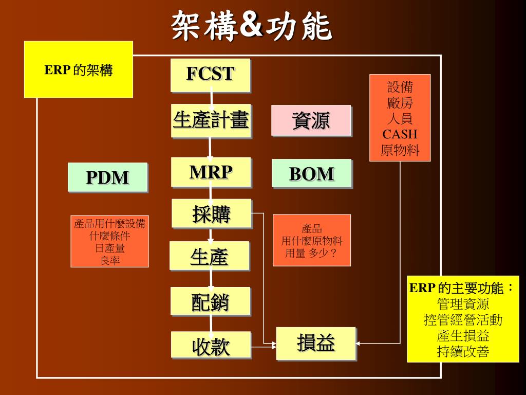 架構&功能 ERP 的架構 FCST 設備 廠房 人員 CASH 原物料 生產計畫 資源 MRP BOM PDM 採購 產品 用什麼原物料 用量 多少? 產品用什麼設備 什麼條件 日產量 良率 生產 ERP 的主要功能: 管理資源 控管經營活動 產生損益 持續改善 配銷 損益 收款