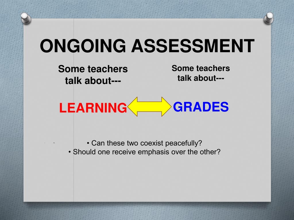 ONGOING ASSESSMENT Some teachers talk about--- LEARNING • VS. Some teachers talk about--- GRADES • Can these two coexist peacefully? • Should one receive emphasis over the other?