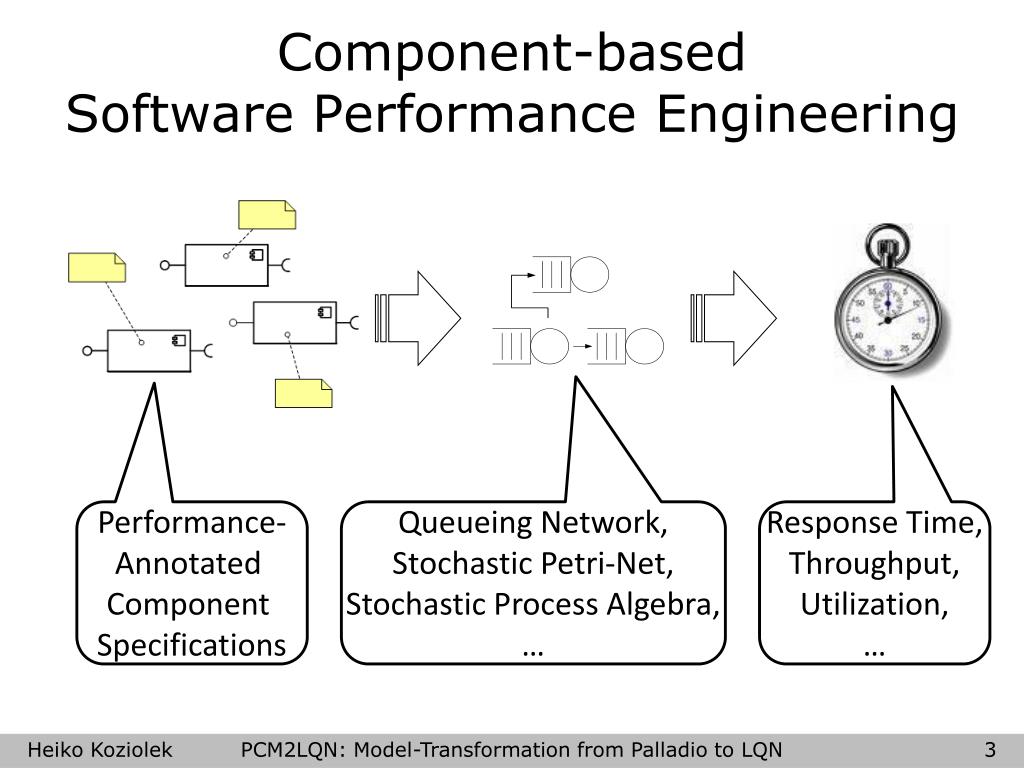 A Model Transformation from the P alladio C omponent M odel to L ayered Q ueueing N etworks. University of Oldenburg, Germany. DFG-Project PALLADIO. Graduate School TRUSTSOFT. PCM2LQN. Heiko Koziolek , Ralf Reussner. Component-based Software Performance Engineering.