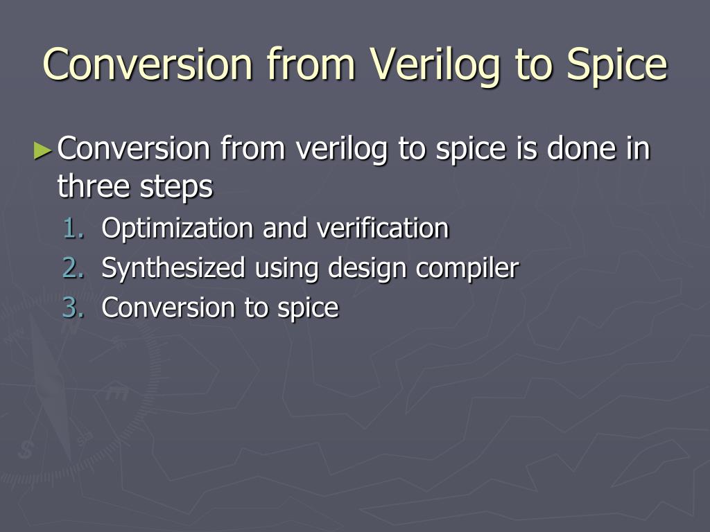 Conversion from Verilog to Spice • Conversion from verilog to spice is done in three steps • Optimization and verification • Synthesized using design compiler • Conversion to spice