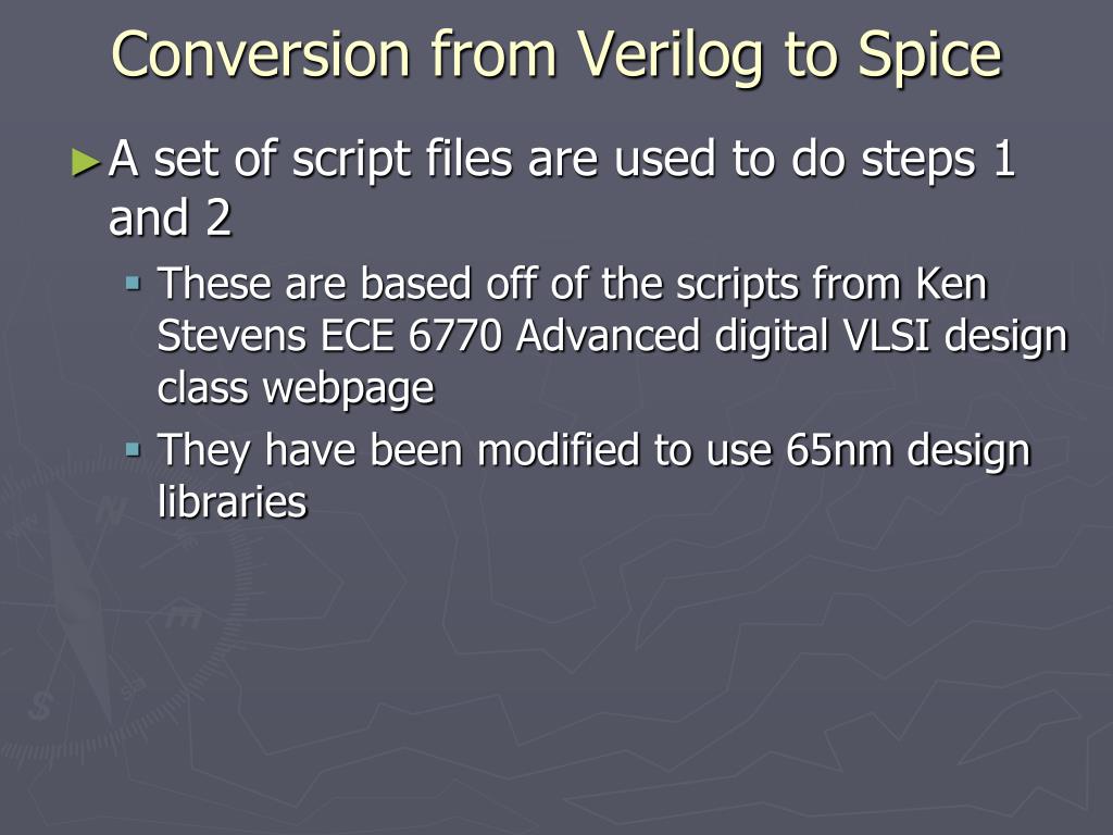Conversion from Verilog to Spice • A set of script files are used to do steps 1 and 2 • These are based off of the scripts from Ken Stevens ECE 6770 Advanced digital VLSI design class webpage • They have been modified to use 65nm design libraries