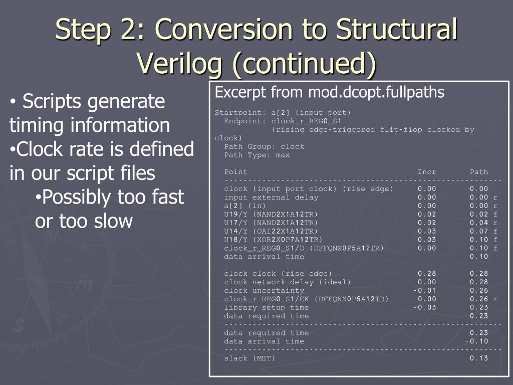 Step 2: Conversion to Structural Verilog (continued) Excerpt from mod.dcopt.fullpaths Startpoint: a[2] (input port) Endpoint: clock_r_REG0_S1 (rising edge-triggered flip-flop clocked by clock) Path Group: clock Path Type: max Point Incr Path ----------------------------------------------------------- clock (input port clock) (rise edge) 0.00 0.00 input external delay 0.00 0.00 r a[2] (in) 0.00 0.00 r U19/Y (NAND2X1A12TR) 0.02 0.02 f U17/Y (NAND2X1A12TR) 0.02 0.04 r U14/Y (OAI22X1A12TR) 0.03 0.07 f U18/Y (XOR2X0P7A12TR) 0.03 0.10 f clock_r_REG0_S1/D (DFFQNX0P5A12TR) 0.00 0.10 f data arrival time 0.10 clock clock (rise edge) 0.28 0.28 clock network delay (ideal) 0.00 0.28 clock uncertainty -0.01 0.26 clock_r_REG0_S1/CK (DFFQNX0P5A12TR) 0.00 0.26 r library setup time -0.03 0.23 data required time 0.23 ----------------------------------------------------------- data required time 0.23 data arrival time -0.10 ----------------------------------------------------------- slack (MET) 0.13 • Scripts generate timing information • Clock rate is defined in our script files • Possibly too fast or too slow